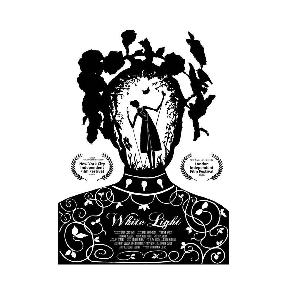 White Light designed and directed by Richard Nik Evans is an experimental film based on a poem written and performed by Vera Graziadei. It follows an anonymous supernatural character on a journey to discover the mysteries of existence and our ephemeral connection to the printed word.